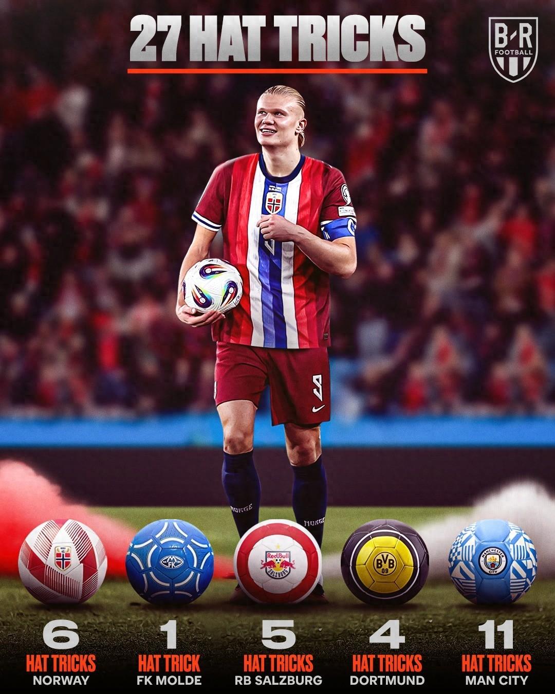 哈蘭德27次帽子戲法分佈:曼城11次最多,挪威國家隊6次
