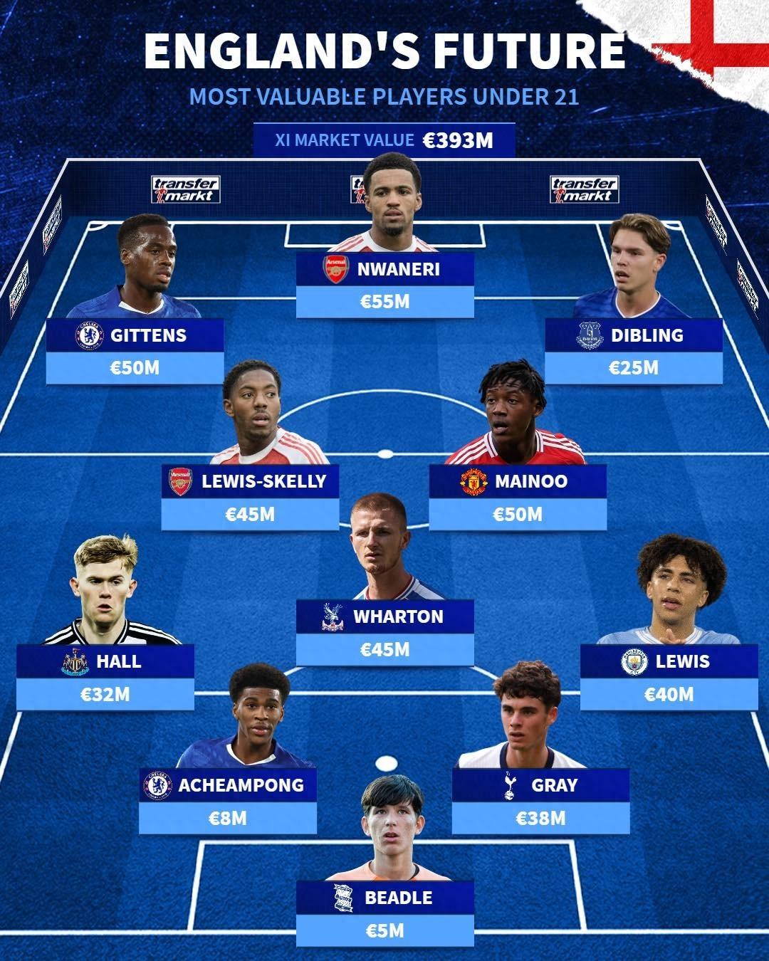 北京時間10月12日,德轉市場更新英格蘭U21身價最貴陣容,其中阿森納球員恩瓦內裏以5500萬歐元居首。