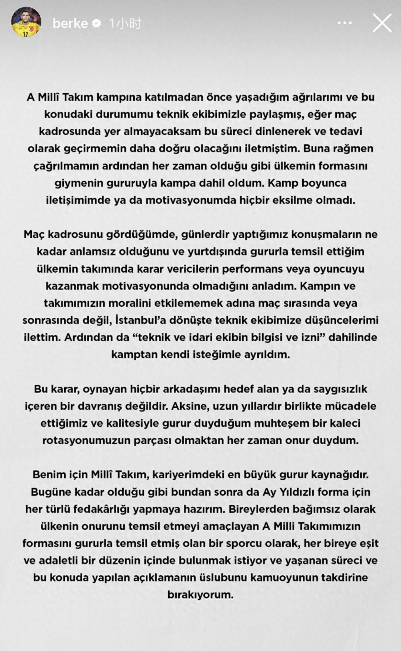 當我看到比賽名單時,我意識到,這些天我們所做的一切交流都變得毫無意義,也明白了,在我自豪地於海外代表祖國的球隊中,決策者們的出發點並不是球員的表現或幫助球員成長的意願。爲了不影響集訓營和球隊的士氣,我沒有在比賽期間或比賽結束後表達看法,而是在返回伊斯坦布爾後,把自己的想法告訴了教練組。隨後,在教練組和管理層的知情與同意下,我主動選擇離開了集訓營。