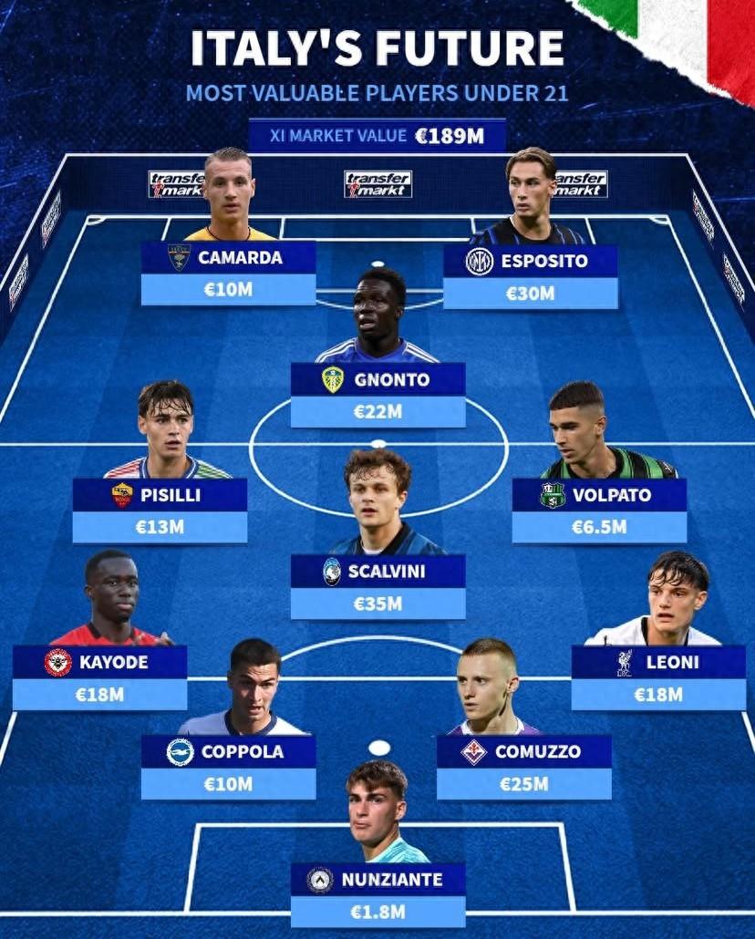德轉列意大利U21最貴11人陣容:
