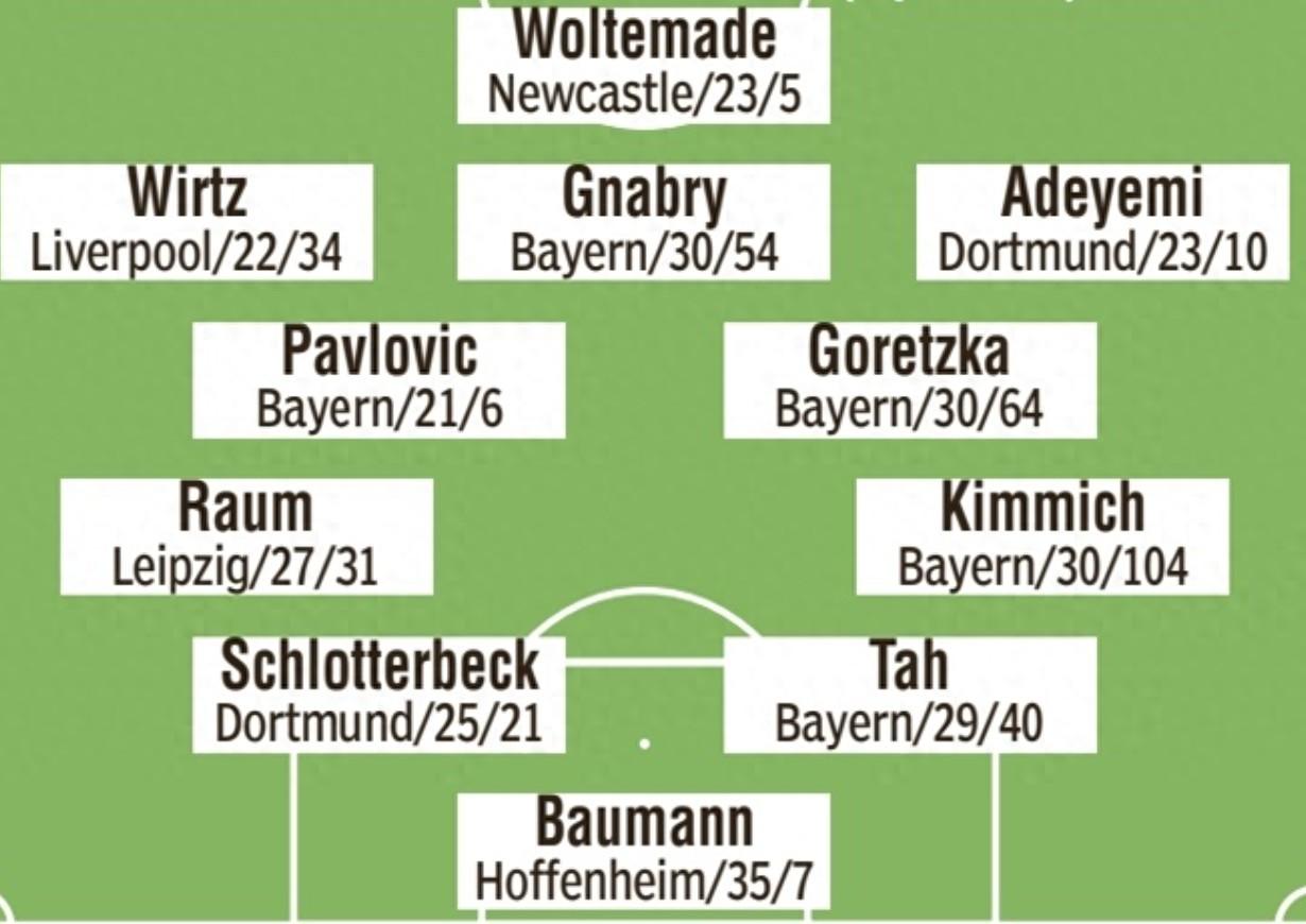 奧利弗-鮑曼;基米希、約納坦-塔、施洛特貝克、勞姆;格雷茨卡、亞歷山大-帕夫洛維奇;阿德耶米、格納布里、維爾茨;沃爾特馬德