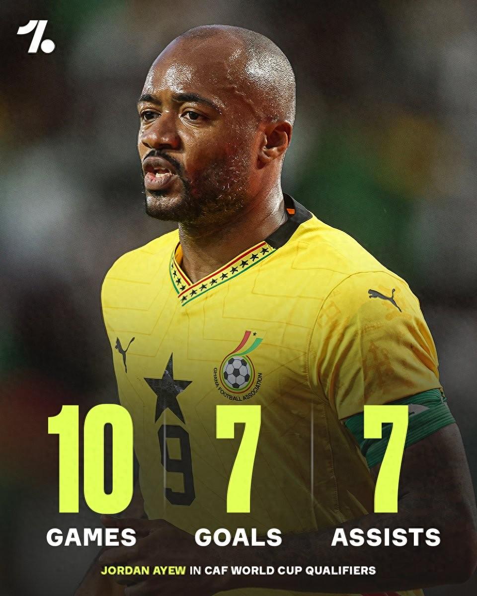 在加納隊此次的晉級征途中,34歲的老將喬丹-阿尤扮演了至關重要的角色。他在10場世界盃非洲區預選賽中9次首發、1次替補,貢獻7粒進球和7次助攻,不僅暫列世非預助攻榜榜首,同時也暫列射手榜並列第五,堪稱“黑星軍團”的頭號功臣。