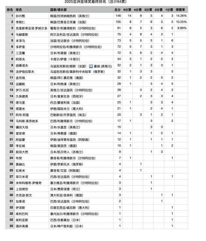 《體壇週報》2025年亞洲金球獎評選詳細排名