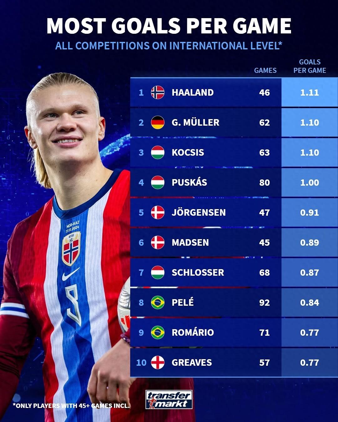 德轉列國家隊場均進球榜:哈蘭德領跑,蓋德-穆勒位列次席