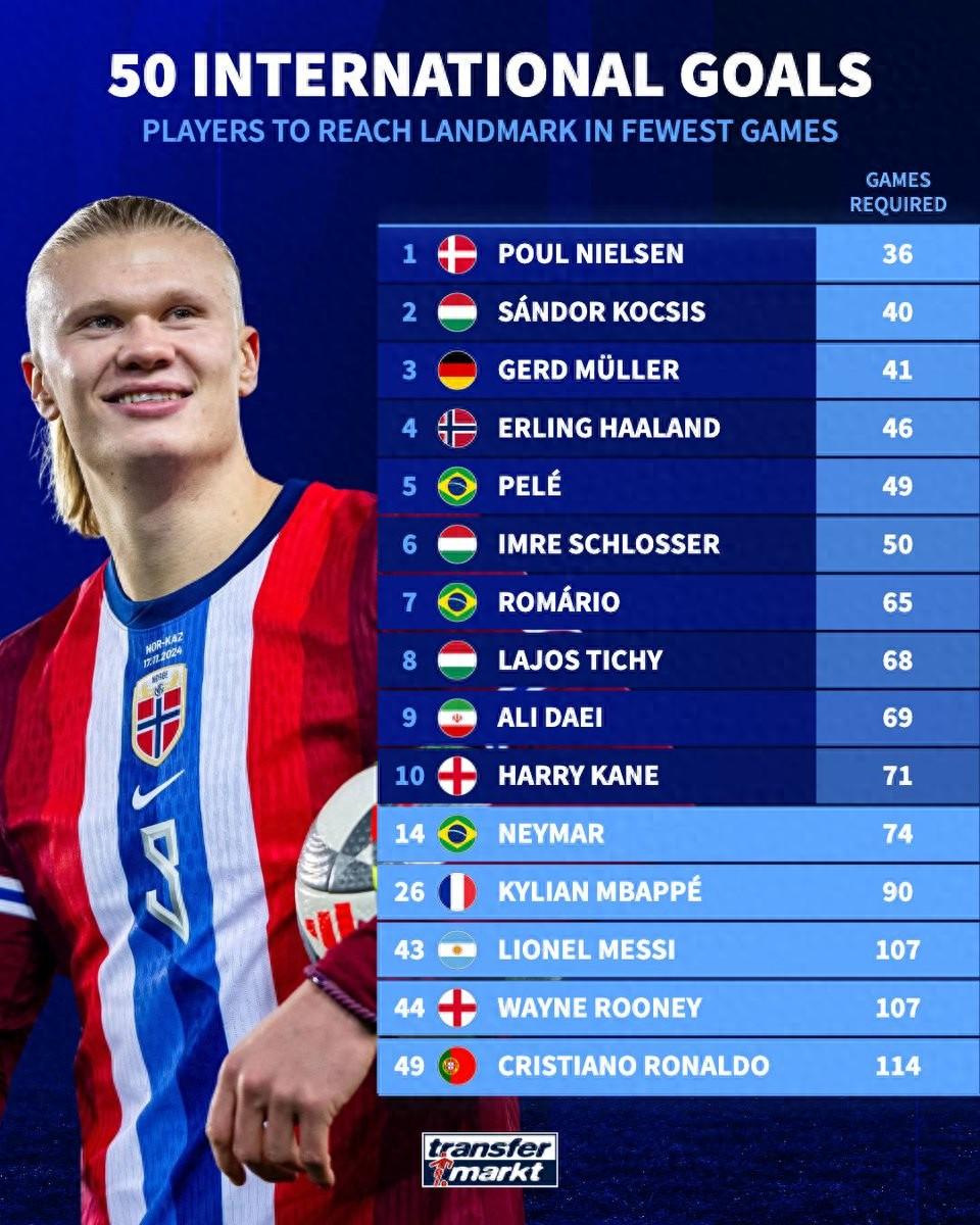 北京時間10月13日,德國轉會市場盤點了國家隊最快打入50球的球員榜單。其中,丹麥傳奇前鋒尼爾森高居榜首,他僅用了36場比賽便達成了這一里程碑。