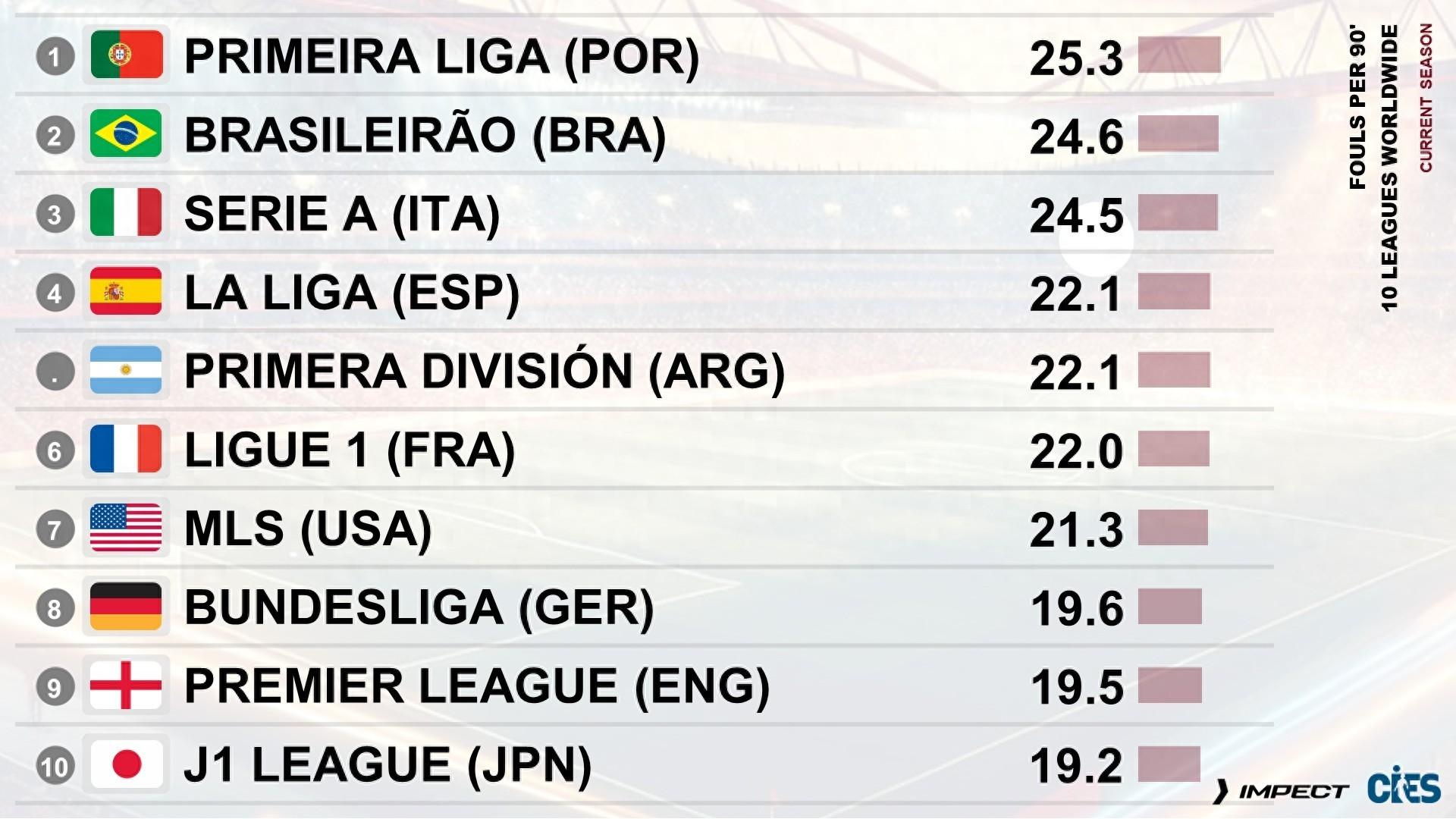 各聯賽每90分鐘犯規次數榜:葡超25.3次居首、意甲24.5次第三