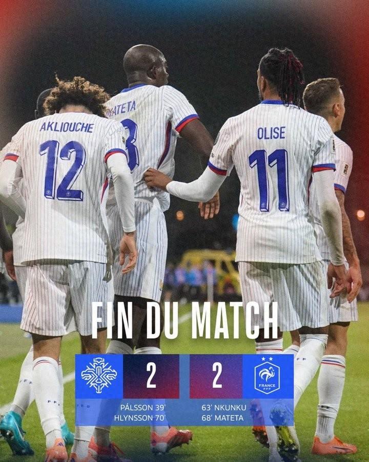 北京時間10月14日,在世預賽歐洲區的比賽中,法國隊依靠恩昆庫和馬特塔的進球客場2-2戰平冰島,目前他們以3勝1平的成績位列D組的第一位。