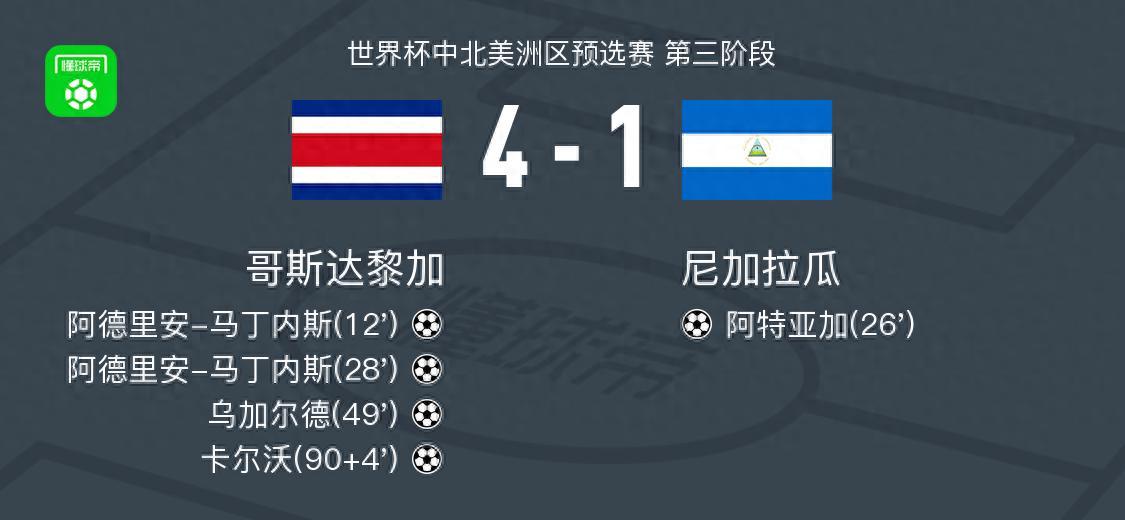 北京時間10月14日世界盃中北美洲區預選賽 第三階段,哥斯達黎加對陣尼加拉瓜。哥斯達黎加阿德里安-馬丁內斯梅開二度,烏加爾德破門,卡爾沃破門。尼加拉瓜阿特亞加破門。最終比分哥斯達黎加 4-1 尼加拉瓜。