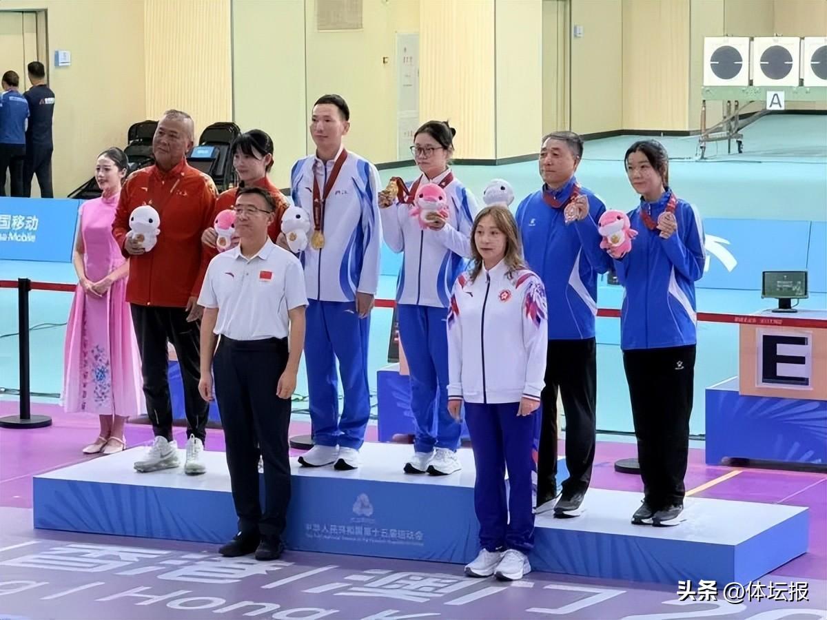 全運會奪冠後,韓佳予只是低頭收拾裝備,佩戴好黑框眼鏡,面向掌聲雷動的觀衆席微微欠身致意,神情平靜。直到走上最高領獎臺,和教練一起佩戴上這枚沉甸甸的金牌後,她才露出淡淡的微笑。