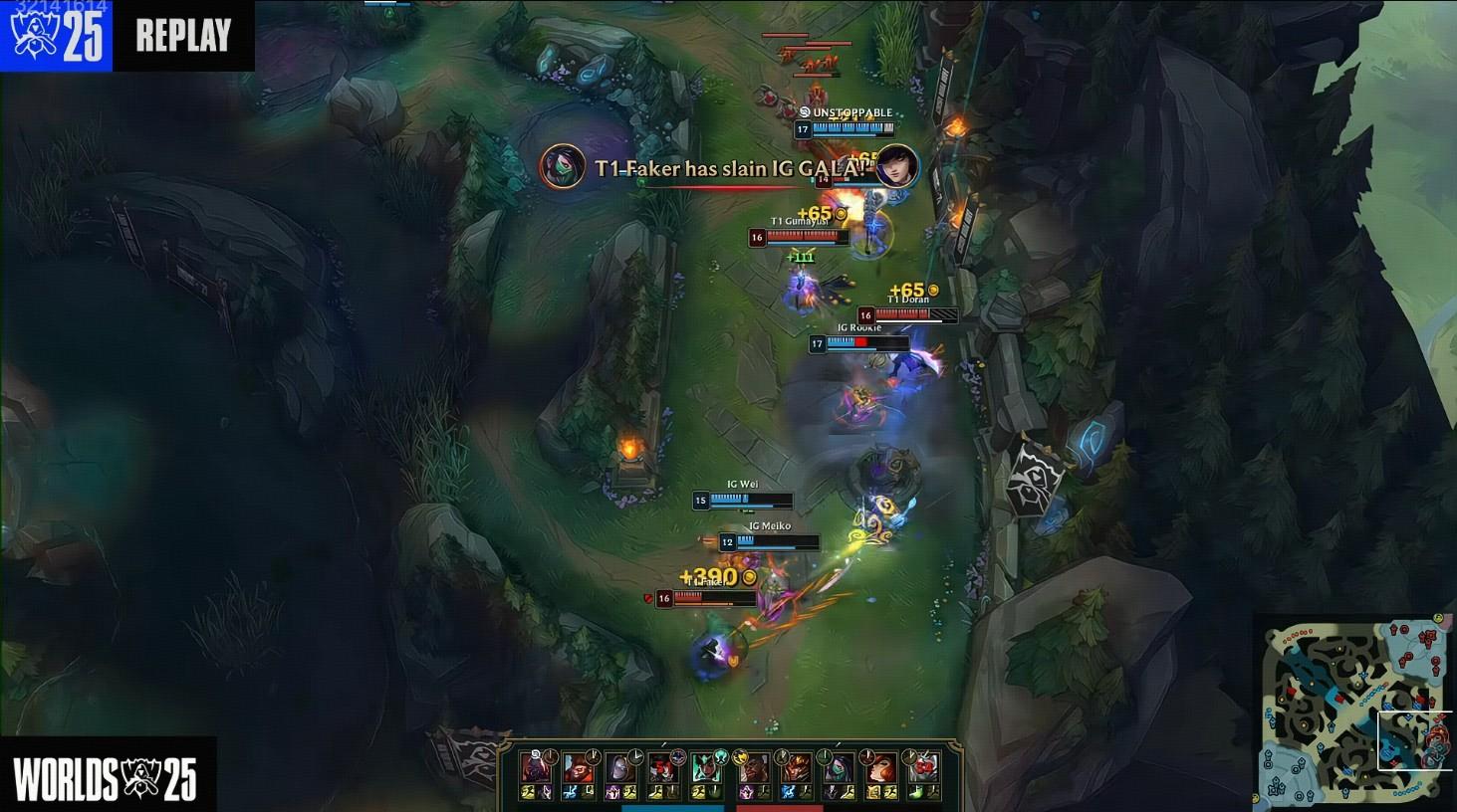 第21分鐘,Faker阿卡麗對Rookie發條完成單殺,隨後女警也被開死,T1收下厄塔汗,逆轉前期劣勢;