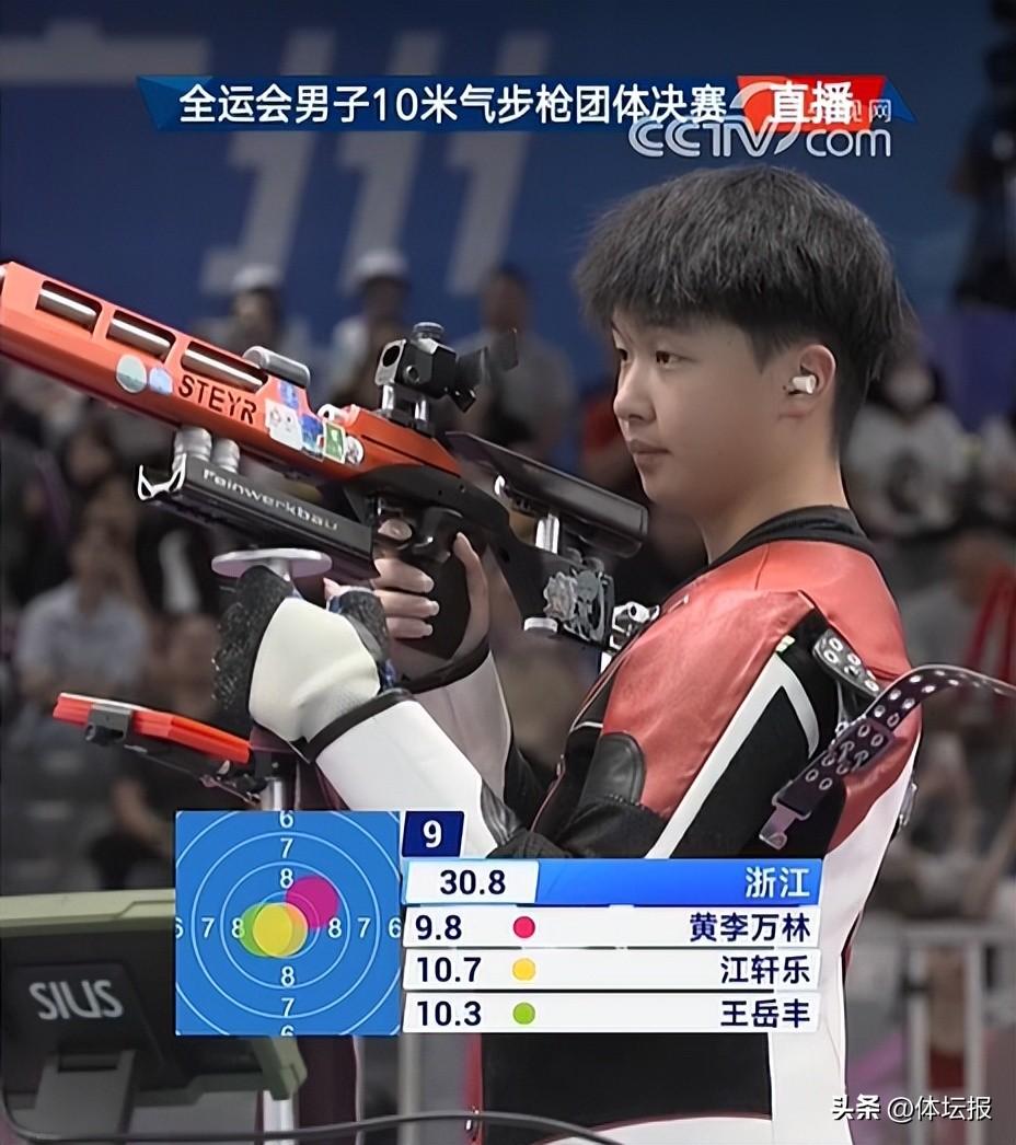 10月15日,第十五屆全國運動會射擊賽場浙江隊再添一枚獎牌。在男子10米氣步槍團體決賽中,浙江隊的黃李萬林、江軒樂、王嶽豐,以9:17不敵由奧運冠軍劉宇坤領銜的陝西隊,摘得銀牌。陝西隊、遼寧隊分獲金牌和銅牌。至此,浙江射擊隊在本屆全運會收穫2金1銀。