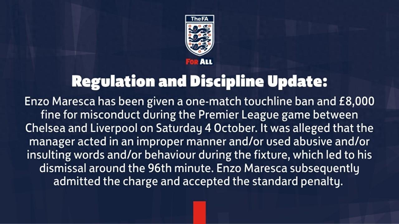 北京時間10月15日,英足總官方發佈公告,公佈了對馬雷斯卡的處罰措施,後者在對陣利物浦的比賽中被紅牌罰出場外。