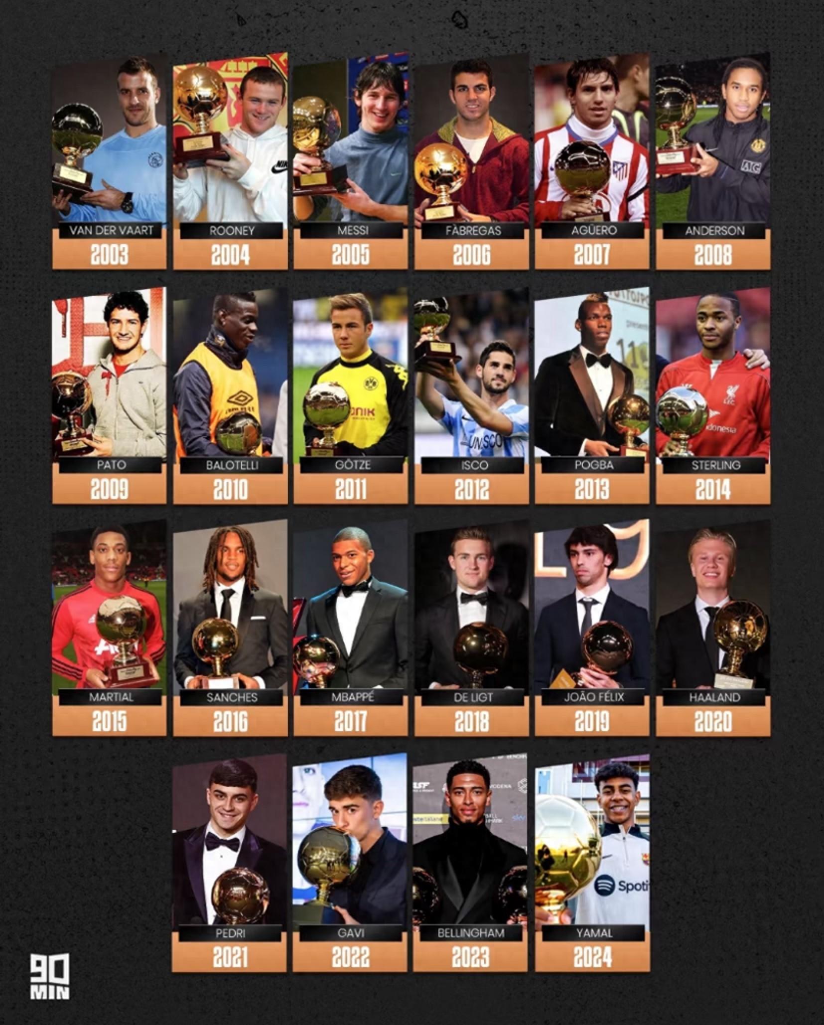 歷年金童獎得主:梅西、魯尼、姆巴佩領銜,上屆亞馬爾加冕