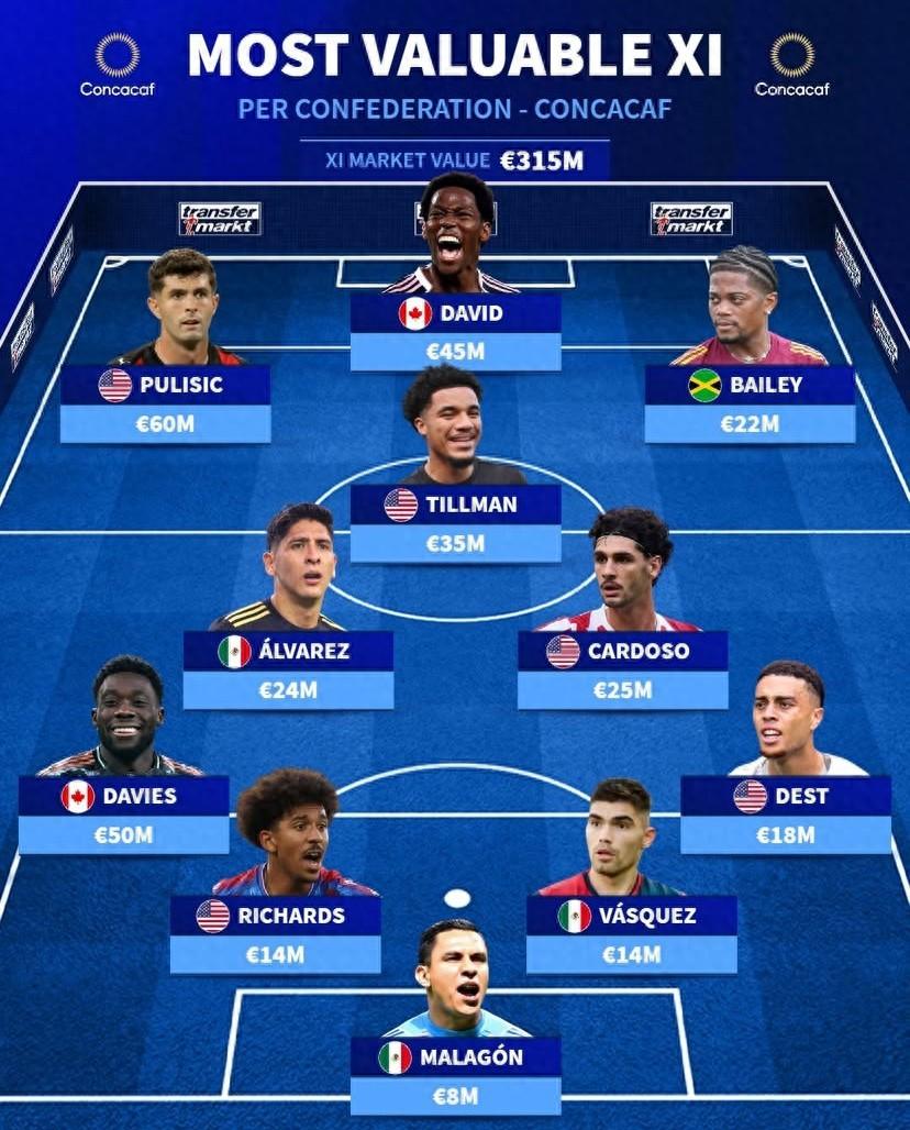 德轉列中北美洲及加勒比地區球員最貴11人陣容: