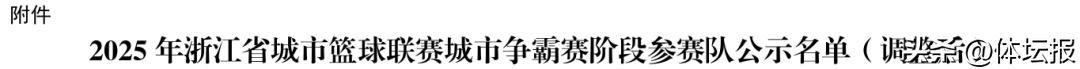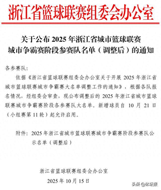 通知中提到,依據《浙江省籃球聯賽組委會辦公室關於開展2025年浙江省城市籃球聯賽城市爭霸賽大名單調整工作的通知》,根據各隊報名情況,經組委會審查,現公佈調整後的2025年浙江省城市籃球聯賽城市爭霸賽階段各參賽隊大名單。