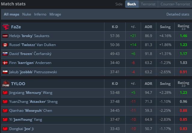 決勝圖Mirage,天祿防守方收穫5-0夢幻開局,但此後槍法頻頻變形,Jee大狙手感冰涼,目送FaZe回敬5-0小高潮,最終FaZe 13-8贏下圖三。