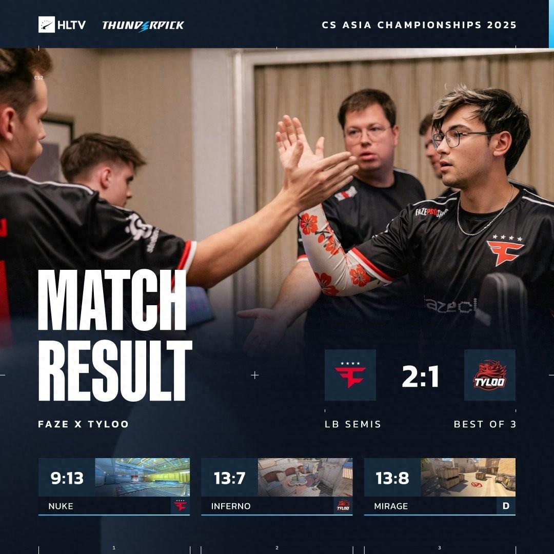 北京時間10月16日,CS2025亞洲邀請賽(CS Asia Champion)小組賽,中國戰隊TYLOO 1-2不敵FaZe,與另一支CN戰隊LVG戰績同爲1勝2負,無緣晉級。