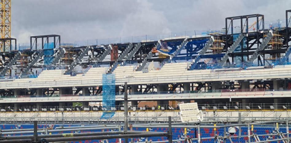 側看臺的建設階段預計還會持續幾天,如果計劃不變,接下來將會是北看臺的第三層建設,之後是南看臺和主看臺區域的施工。