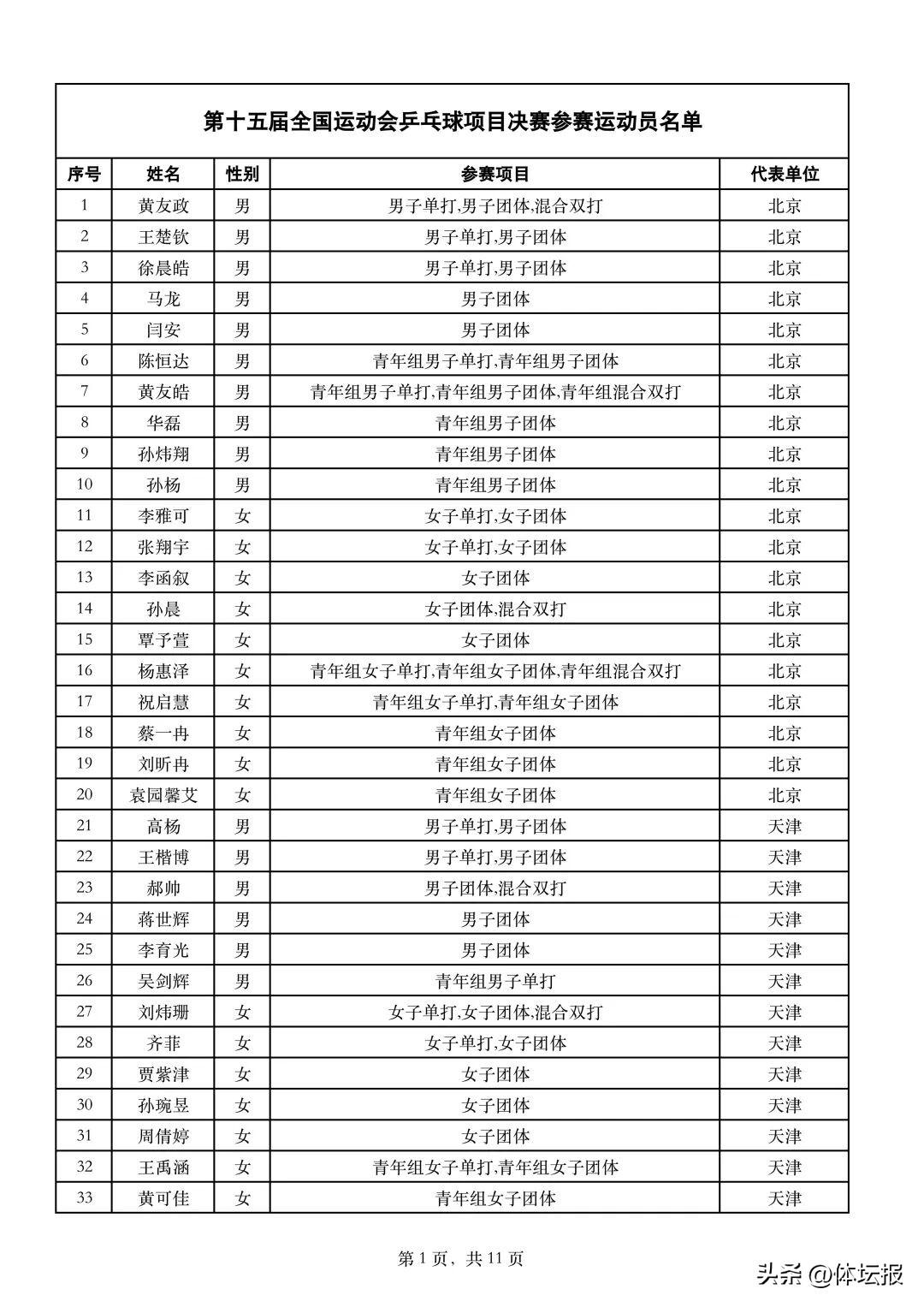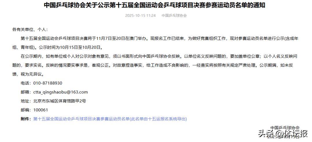 中國乒乓球協會此前公示本屆全運會決賽參賽運動員名單。