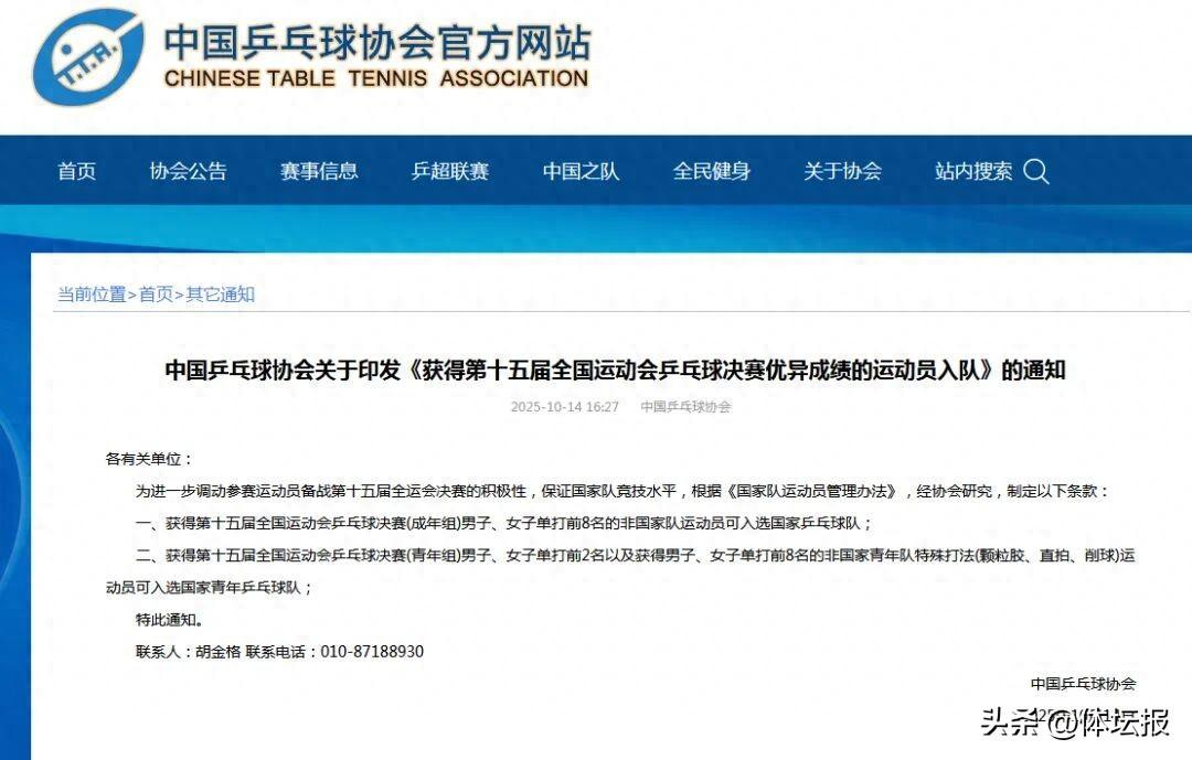 近日,中國乒乓球協會發布《獲得第十五屆全國運動會乒乓球決賽優異成績的運動員入隊》的通知,爲尚未入選國家乒乓球隊的運動員們提供晉升契機。