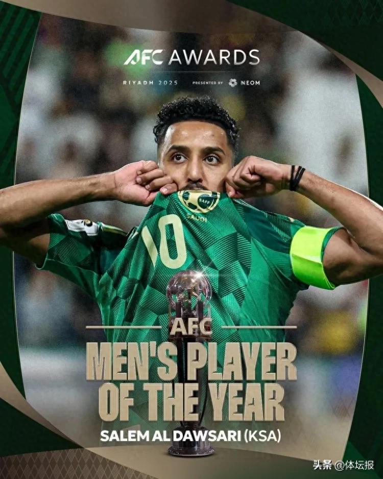 沙特球員薩勒姆·達瓦薩里當選亞足聯年度最佳男足球員。這是達瓦薩里繼2022年後第二次獲得該獎。憑藉此次獲獎,他成爲了首位兩次當選亞足聯年度最佳男足球員的沙特球員。
