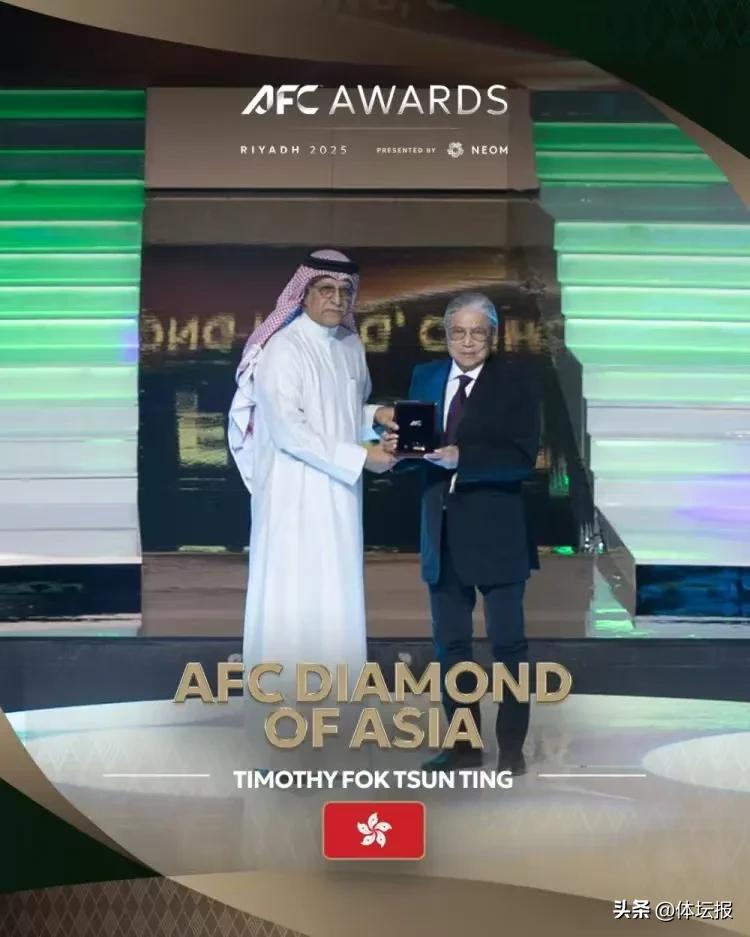 中國香港足球總會名譽主席霍震霆獲得亞洲足球聯合會亞洲之鑽獎。
