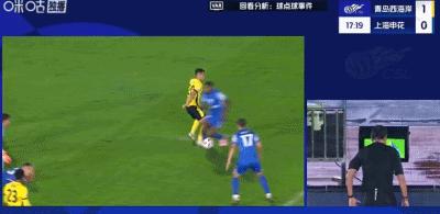 第20分鐘,馬納法造點,吳曦點球破門,申花1-1扳平比分