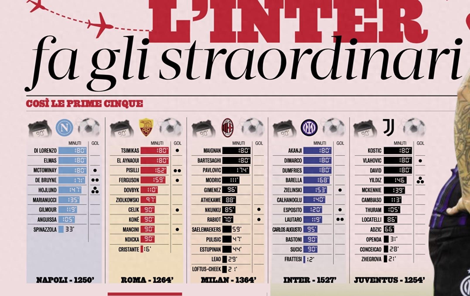 北京時間10月18日,《米蘭體育報》統計了意甲目前排名前五的球隊各自球員在10月國際比賽日的出場時間,國際米蘭以12名球員合計1527分鐘排名第一,AC米蘭13名球員1364分鐘第二。