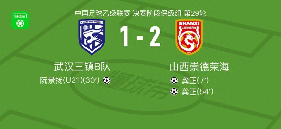 北京時間10月18日,中國足球乙級聯賽決賽階段保級組第29輪,武漢三鎮B隊主場迎戰山西崇德榮海。比賽開局階段,山西崇德榮海由張奧送出助攻,龔正率先破門。第30分鐘,阮景揚爲武漢三鎮B隊扳平比分。易邊再戰,第54分鐘,龔正再度建功,幫助山西崇德榮海再次取得領先。最終全場比賽結束,武漢三鎮B隊以1比2不敵山西崇德榮海。