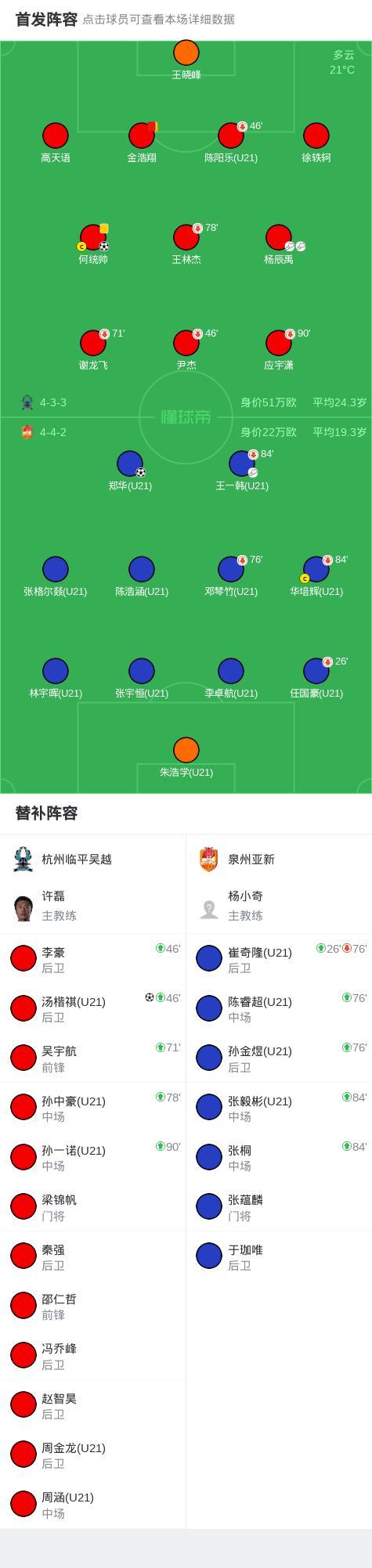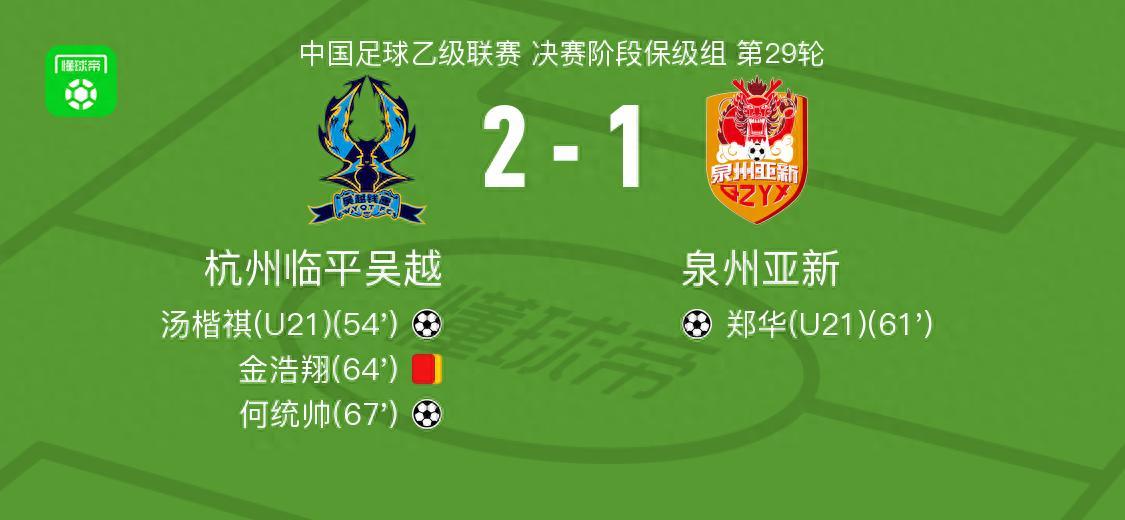 北京時間10月18日中國足球乙級聯賽 決賽階段保級組 第29輪,杭州臨平吳越主場對陣泉州亞新。杭州臨平吳越湯楷祺破門,何統帥破門。泉州亞新鄭華破門。最終比分杭州臨平吳越 2-1 泉州亞新。