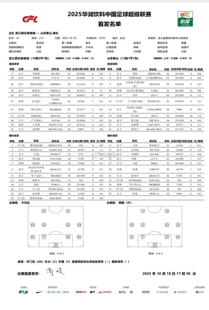 北京時間10月18日19:35,中超聯賽第27輪,浙江主場迎戰山東,賽前雙方公佈首發陣容: