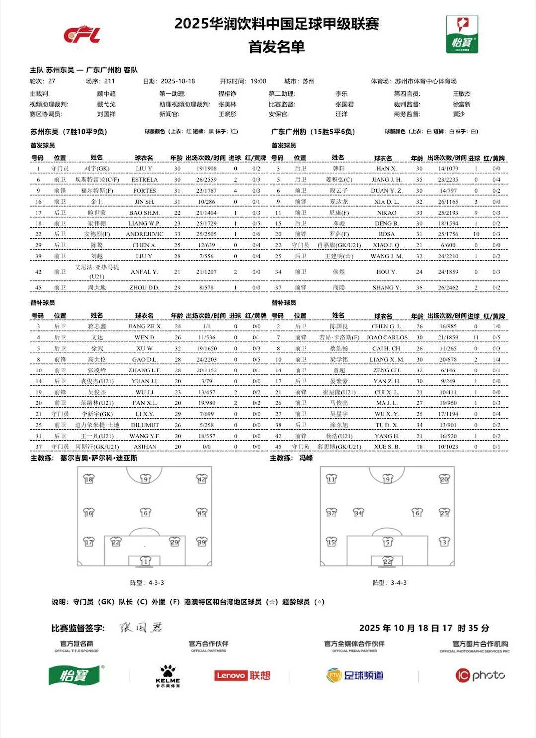 北京時間10月18日19:00,中甲第27輪,蘇州東吳主場迎戰廣東廣州豹。賽前,雙方首發公佈如下: