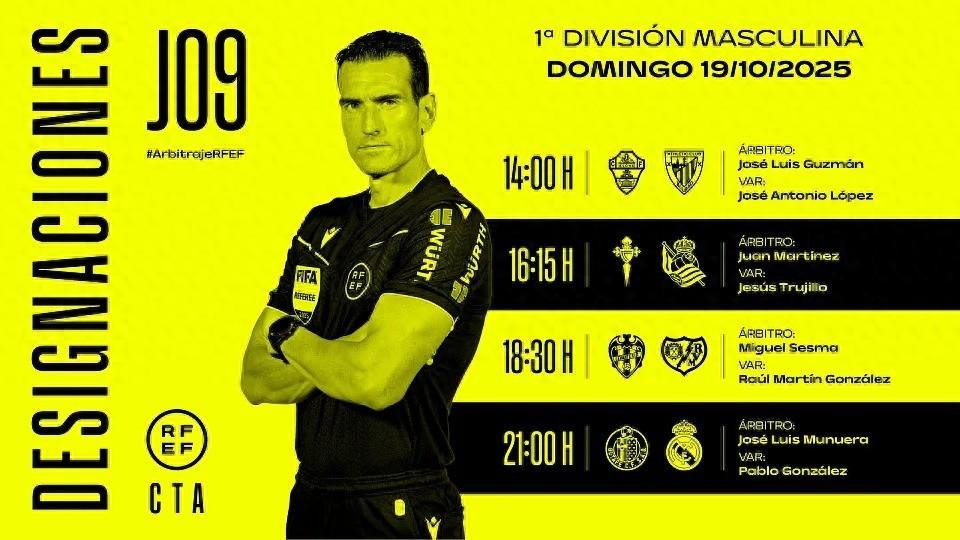 西班牙足協官方公佈了週日西甲比賽裁判安排,何塞-穆努埃拉將執法赫塔費vs皇馬。