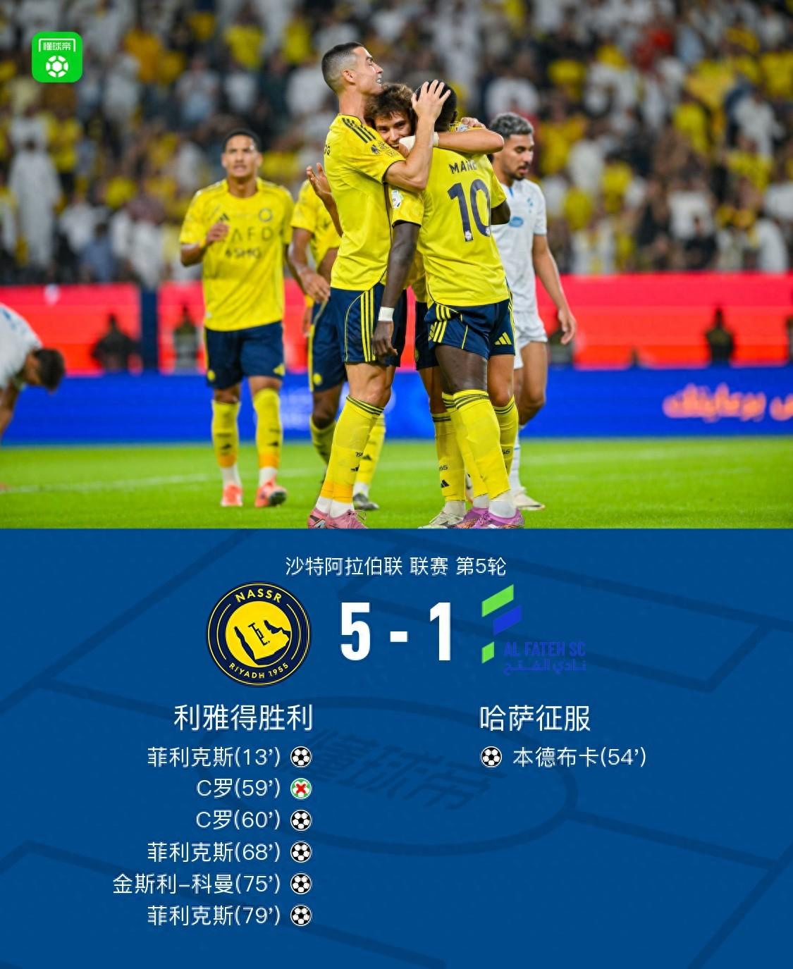 利雅得勝利5-1大勝哈薩征服,菲利克斯戴帽,C羅失點+世界波