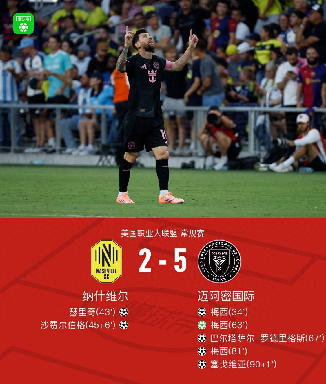 北京時間10月19日美國職業大聯盟 常規賽,納什維爾主場對陣邁阿密國際。上半場,梅西弧頂處勁射破門率先改寫比分。瑟裏奇頭球破門將比分扳平,沙費爾伯格補射破門將比分反超。下半場,梅西點射破門扳平比分。巴爾塔薩爾-羅德里格斯破門將比分超出,伊恩-弗雷助攻,梅西兜射破門完成帽子戲法。梅西助攻塞戈維亞破門鎖定比分。最終,邁阿密國際客場5-2戰勝納什維爾。