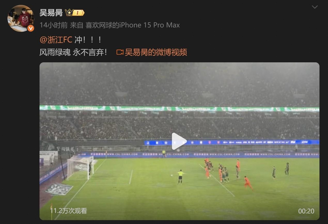 本場比賽,浙江隊門將趙博撲出了山東泰山隊卡扎伊什維利主罰的點球。吳易昺也錄下了趙博撲救點球的過程,並在社交媒體上寫道:“浙江FC 衝!!!風雨綠魂,永不言棄”。