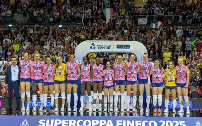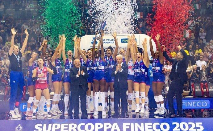 10月18日,2025意大利女排超級盃:米蘭3-2(18-25、25-22、25-20、13-25、15-12)力克科內利亞諾,結束了後者自2019年以來的霸業並奪得俱樂部首個超級盃。埃格努30分(決勝局獨得10分)榮膺MVP、拉涅爾14分,哈克32分、西拉11分、朱婷10分(37扣9中1攔)。