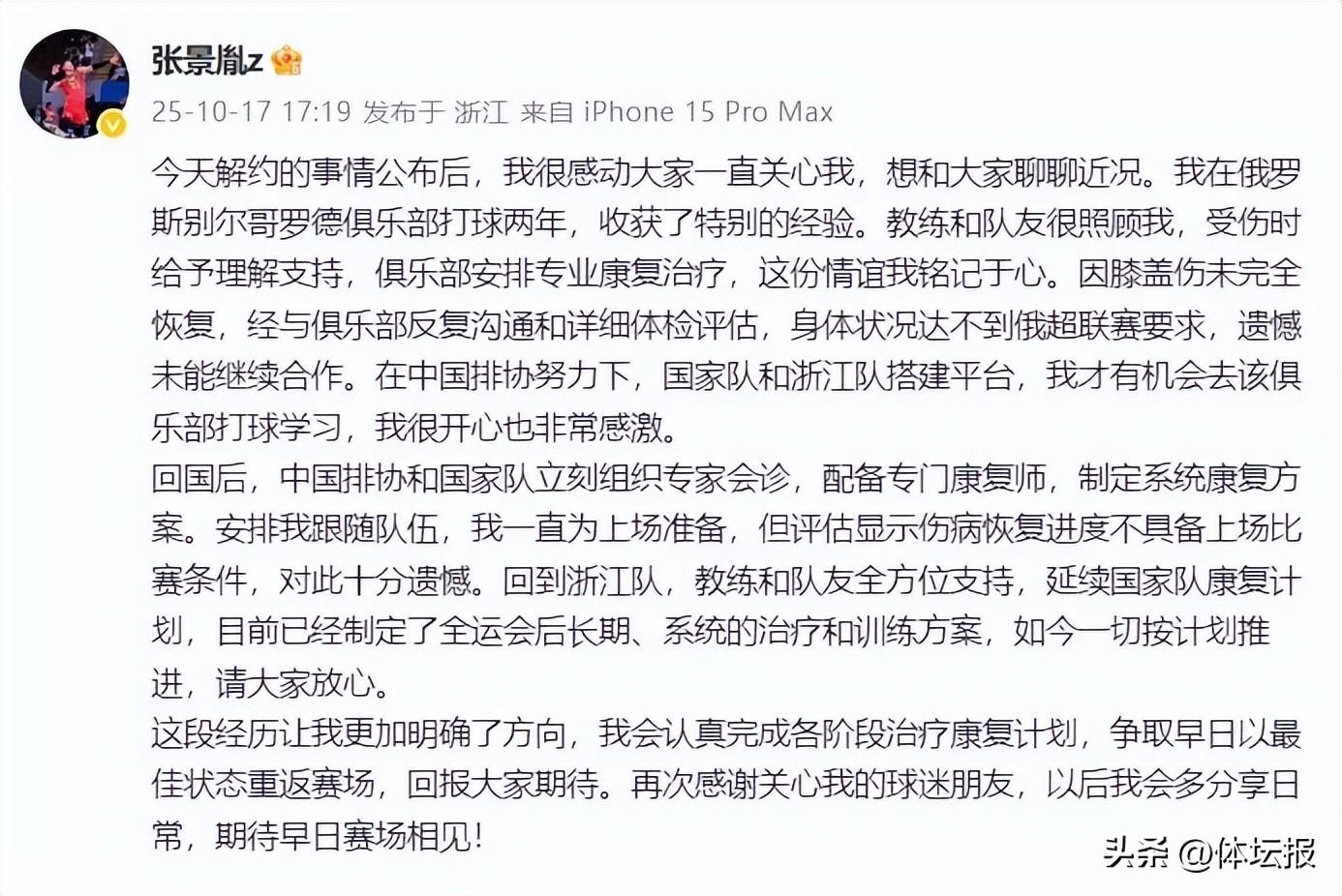 他在社媒寫道:“今天解約的事情公佈後,我很感動大家一直關心我,想和大家聊聊近況。我在俄羅斯別爾哥羅德俱樂部打球兩年,收穫了特別的經驗。教練和隊友很照顧我,受傷時給予理解支持,俱樂部安排專業康復治療,這份情誼我銘記於心。因膝蓋傷未完全恢復,經與俱樂部反覆溝通和詳細體檢評估,身體狀況達不到俄超聯賽要求,遺憾未能繼續合作。在中國排協努力下,國家隊和浙江隊搭建平臺,我纔有機會去該俱樂部打球學習,我很開心也非常感激。