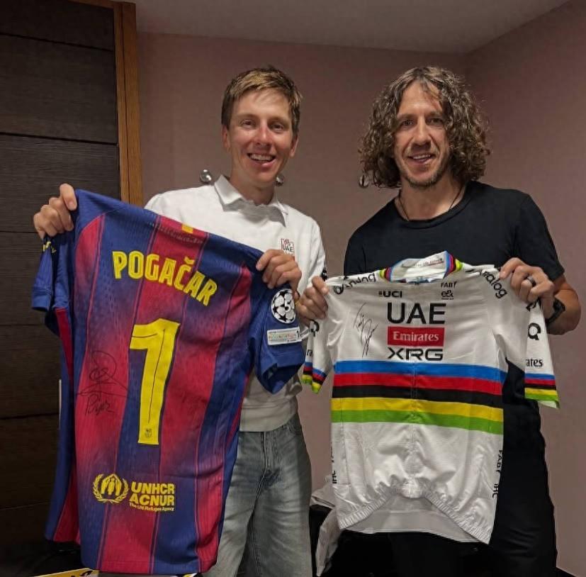 塔代伊-波加查目前在安道爾參加安道爾自行車大師賽,他與普約爾合影,手上拿着印有自己姓氏和號碼1號的巴薩球衣。