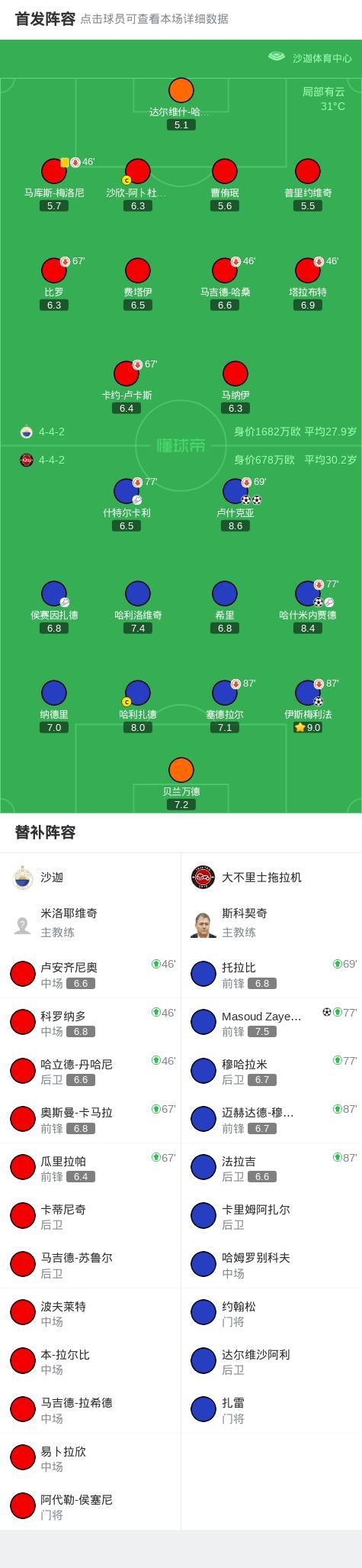 北京時間10月21日,亞足聯冠軍精英聯賽聯賽階段第3輪,沙迦迎戰大不里士拖拉機。比賽開始後,大不里士拖拉機迅速進入狀態,哈什米內賈德送出助攻,盧什克亞接球后破門先拔頭籌。隨後不久,侯賽因扎德送出精準傳球,盧什克亞再度建功完成梅開二度。第40分鐘,哈什米內賈德憑藉個人能力突入進攻區域,冷靜施射將球送入網窩,擴大領先優勢。上半場補時階段,什特爾卡利送出關鍵助攻,伊斯梅利法抓住機會推射得手,進一步鞏固比分。進入下半場,大不里士拖拉機持續施壓,第84分鐘,Masoud Zayer Kazemayn在禁區內果斷起腳,攻入球隊第五粒進球。最終全場比賽結束,沙迦 0-5 不敵大不里士拖拉機。
