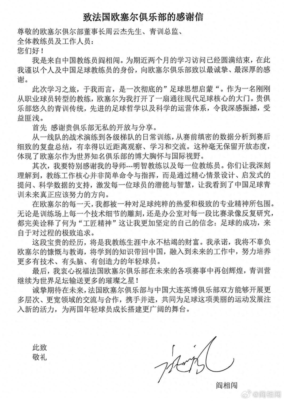 北京時間10月21日,閻相闖在社交媒體上發文感謝了歐塞爾俱樂部,此前他在這裏進行了爲期兩個月的海外學習。