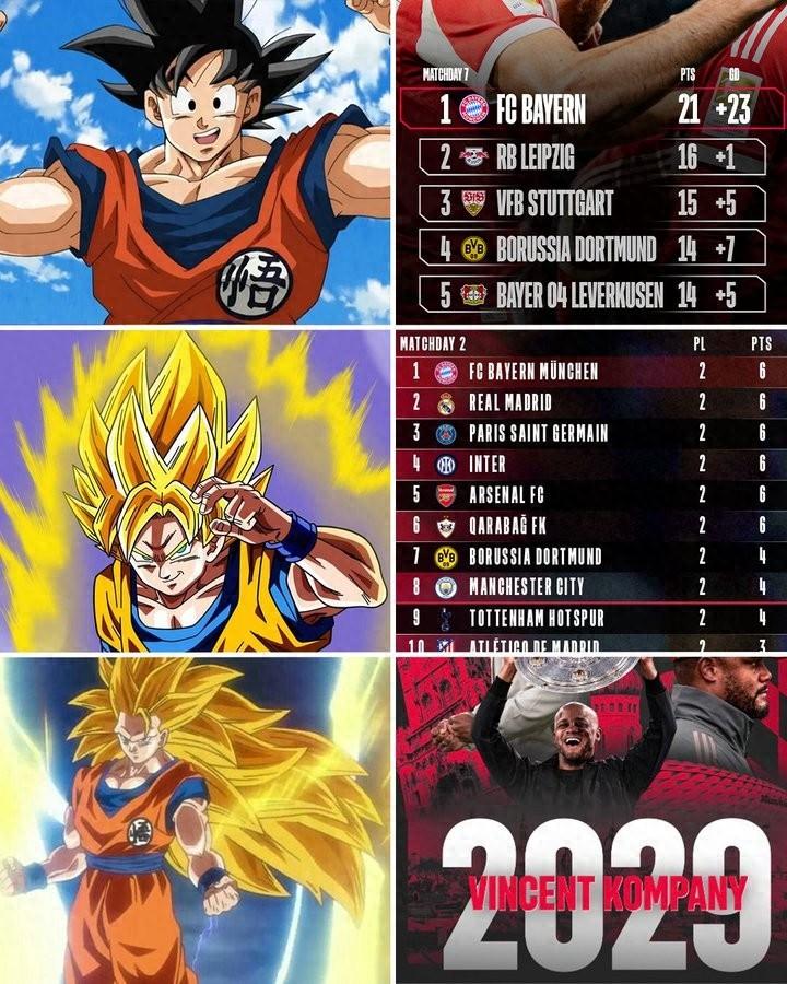 拜仁官方在社交媒體上曬出了一張海報,右邊第一張圖是德甲積分榜,目前拜仁位居榜首,而左邊對應的是《七龍珠》裏的悟空。右邊第二張圖是目前的歐冠積分榜,拜仁目前以6分位居積分榜榜首,而左邊對應的則是超級賽亞人。