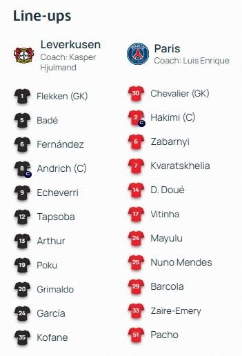 勒沃庫森首發:1-弗萊肯、8-安德里希、5-巴代、12-塔普索巴、13-阿圖爾、6-埃塞基耶爾-費爾南德斯、24-阿萊士-加西亞、20-格里馬爾多、9-埃切韋裏、19-波庫、35-科法內