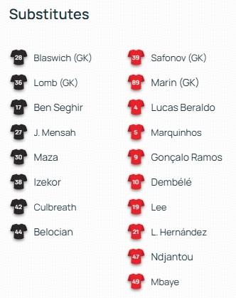 替補:39-薩福諾夫、89-雷納託-馬林、4-貝拉爾多、5-馬爾基尼奧斯、9-拉莫斯、10-登貝萊、19-李剛仁、21-埃爾南德斯、47-恩賈恩圖、49-姆巴耶