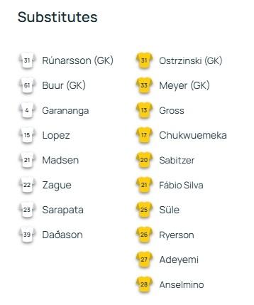 替補:31-奧斯特津斯基、33-亞歷山大-邁爾、13-格羅斯、17-丘庫埃梅卡、20-薩比策、21-法比奧-席爾瓦、25-聚勒、26-瑞爾森、27-阿德耶米、28-安塞爾米諾