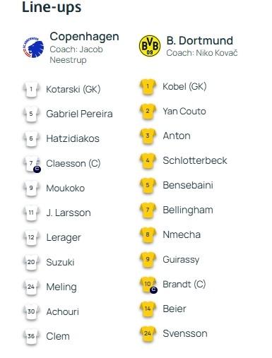 哥本哈根首發:1-科塔爾斯基、5-加布裏埃爾-佩雷拉、6-哈濟迪亞科斯、20-鈴木淳之介、12-勒拉熱爾、24-梅林、36-克萊姆、7-克拉松、9-穆科科、11-喬丹-拉爾森、30-阿舒裏