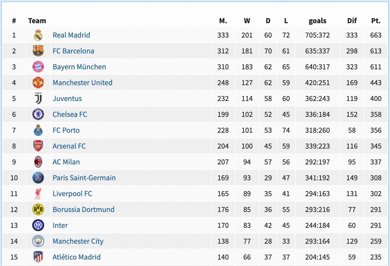 這份歐冠戰績榜的第15名是馬德里競技,牀單軍團6次進入四強3次殺進決賽,均與冠軍失之交臂。