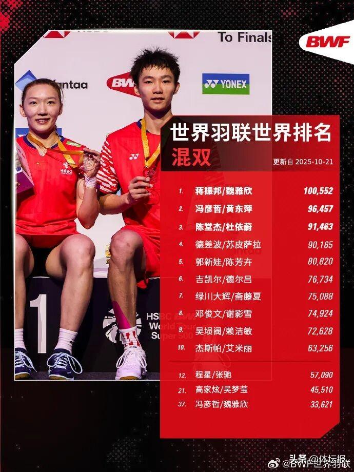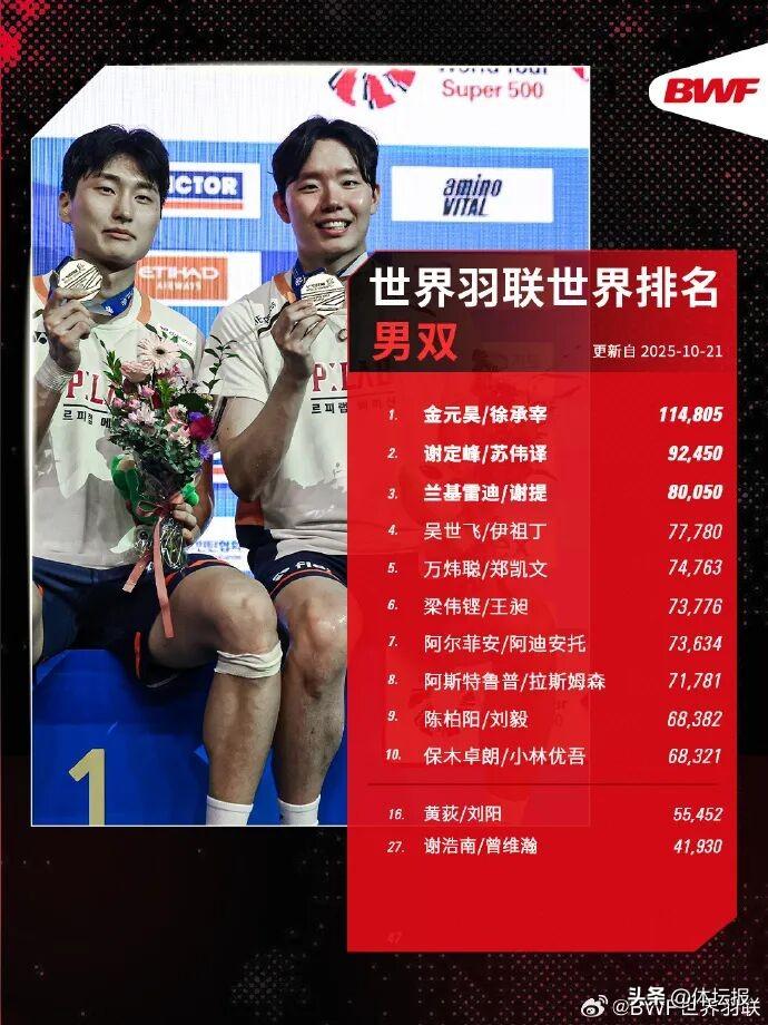 10月21日,世界羽聯官方公佈最新世界排名。石宇奇、安洗瑩、金元昊/徐承宰、劉聖書/譚寧、蔣振邦/魏雅欣分別領跑各單項第一。