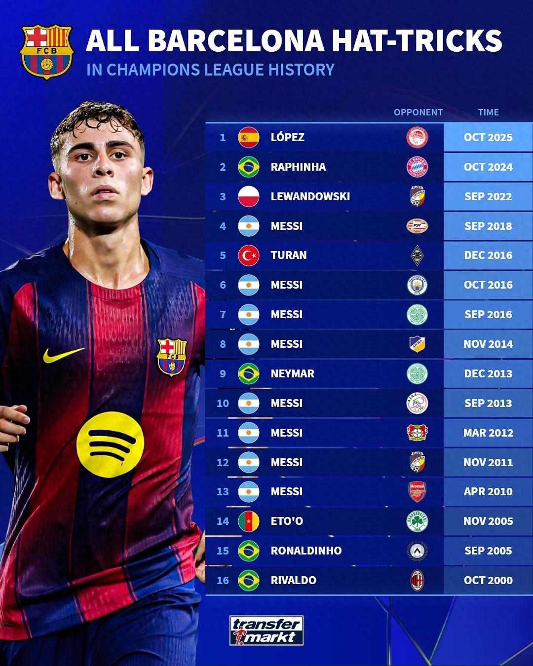 歐冠改制以來巴薩球員戴帽榜:梅西8次居首,費爾明上榜