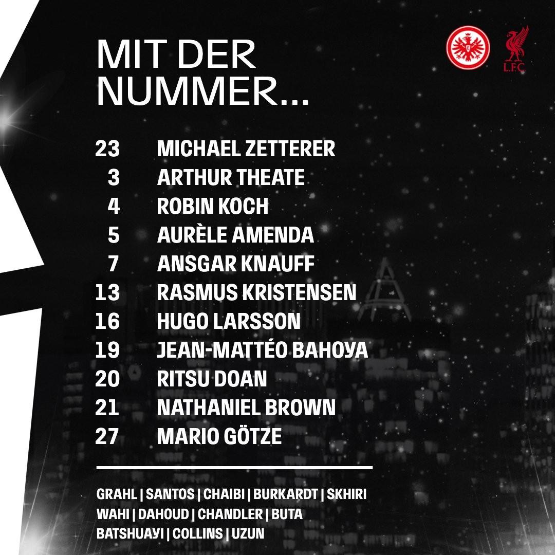 法蘭克福首發:23-澤特爾、3-阿蒂爾-蒂特、4-科赫、5-阿門達、13-拉斯穆斯-克里斯滕森、27-格策、16-胡戈-拉松、7-克瑙夫、20-堂安律、21-納撒尼爾-布朗、19-巴霍亞
